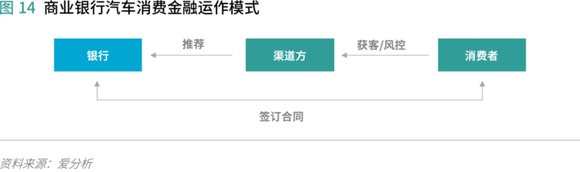 商业银行主要以“B2B2C”模式从事汽车消费金融业务,即不直接面对消费者(C端)而是通过经销商、融资租赁公司、第三方汽车金融服务公司、汽车金融公司、担保公司等中间方(B端)实现对消费者放贷。在汽车消费金融领域,商业银行主要是作为上游的资金提供方存在,只有少数银行会主动独立获客即采取“B2C”直客模式。具体来看,由渠道商负责获客和进行风控,渠道方将符合银行风控标准的客户推荐给银行,由于渠道方熟悉银行风控政策且会兜底,银行的风控审核通过率较高。