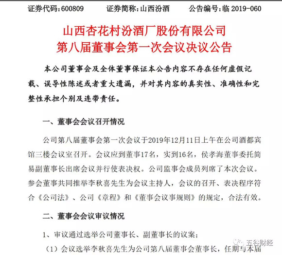 据悉,2019年12月,山西汾酒召开了第八届董事会第一次会议,会议选举李秋喜为公司第八届董事会董事长,并选举谭忠豹、刘卫华和简易为公司第八届董事会副董事长。