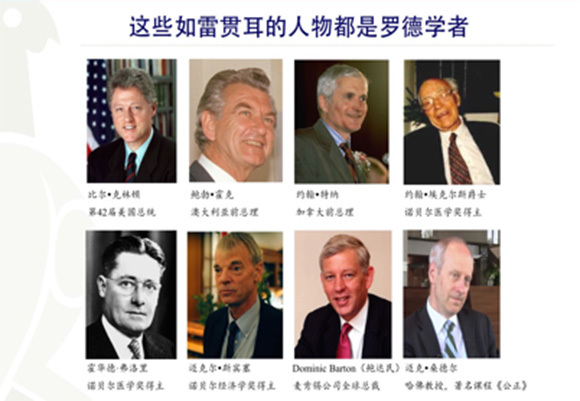 一个世纪以来,罗德奖学金已经培养出了8000多名罗德学者,他们分布在世界各地,活跃在各行各业的前沿。其中不乏有美国前总统比尔·克林顿这样的政坛领袖;青霉素的发现者、诺贝尔奖获得者霍华德·华特·弗洛里,以及麦肯锡全球总裁鲍达民等著名的政治家、科学家、企业家。成为罗德学者,不只是可以获得优质的教育资源,更是得到“一个终身制的会员身份”,从而跻身于世界上最优秀者的行列之中。