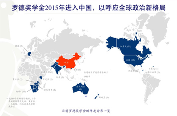 目前罗德奖学金在全球已经扩展到美国、德国、澳大利亚、南非、巴基斯坦、牙买加、印度、中国香港等三十多个国家和地区,中国是罗德奖学金第二个“世纪计划”的首个国家,这对于中国和罗德奖学金来说,都具有历史性的意义。