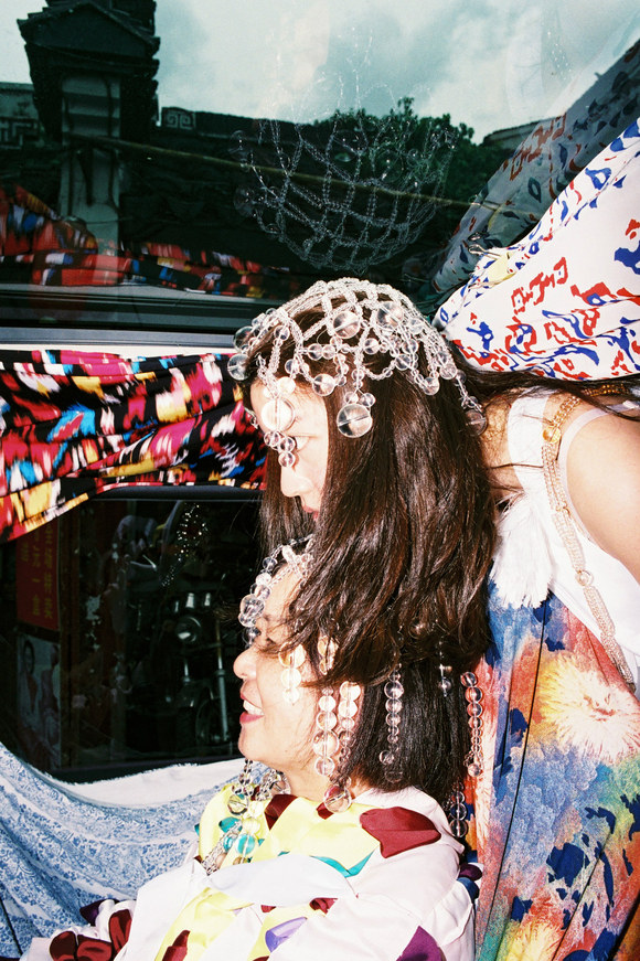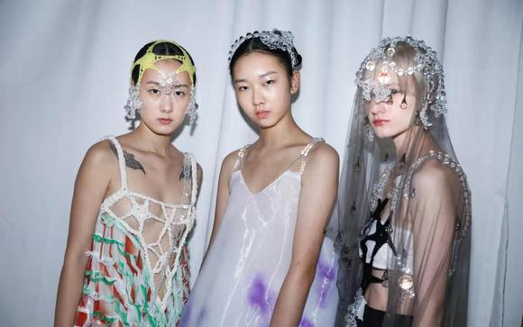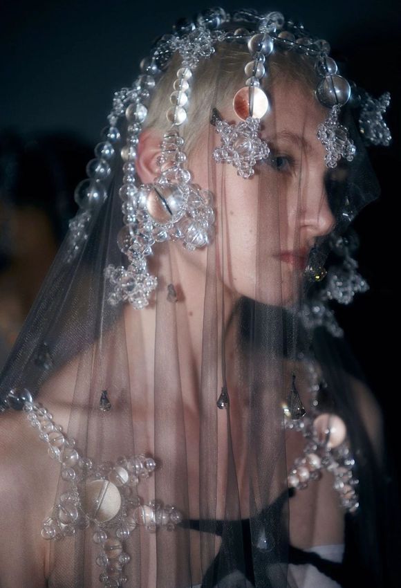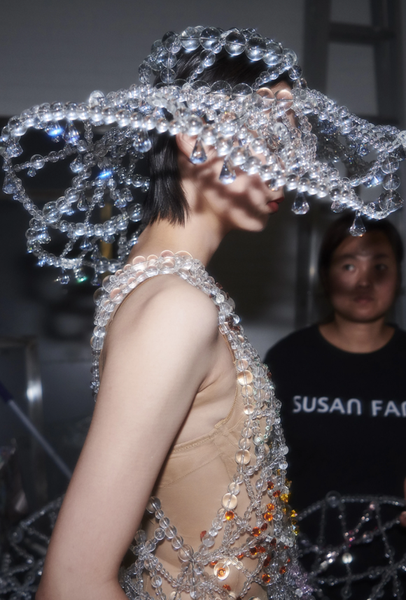 这位26岁的设计师拿出的作品很有辨识度。她设计的帽子、额饰、耳环和文胸是用大小不一的透明水晶玻璃珠组合而成。通透的质地能让配饰适应明暗、色彩不同的背景光,没有明显年代和民族特征能让它们配合各种造型和主题。对穿着的模特也不挑剔,在95后的林允、70后的周迅、60后的惠英红身上都不违和。