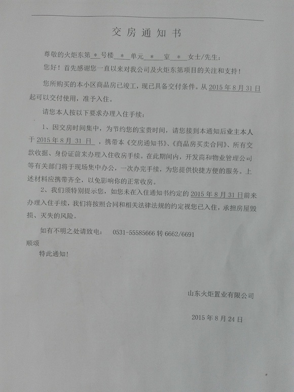 界面新闻记者随后来到火炬东第小区售楼处,玻璃门上贴着的一份《交房通知书》印证了此前的说法。“您所购买的本小区商品房已竣工,现已具备交付条件,从2015年8月31日起可以交付使用,准予入住。请您本人按以下要求办理入住手续。”上述《交房通知书》写道。