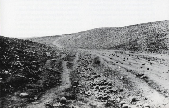 在有史以来拍摄的第一批战地照片中,有一张现在已被广泛认为有造假。1855年,在一场激烈战斗之后,克里米亚战争通讯员Roger Fenton在塞瓦斯托波尔附近拍摄了备受赞誉的《死亡阴影的峡谷》。照片拍下了一条遍布加农炮弹的土路。当时的人们宣称这张照片是英国军队所遭受的猛烈炮击的明证。然而2007年,美国纪录片导演Errol Morris发现了Fenton在相同地点拍摄的另一张照片,在该照片里球状物只出现在路边的沟渠里,路面上并没有。Morris断定摄影师为了获得戏剧性的效果,自己把20多颗炮弹散在了路面上。