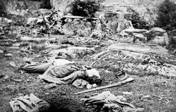 这幅著名照片拍摄于1862年美国内战的安提塔姆战役结束之后。专家认为,战地摄影师Alexander Gardner人为地排列了图中的尸体。