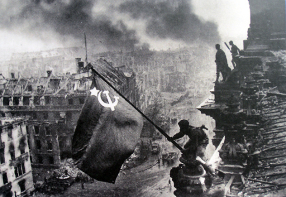 一张类似的红军在轰炸后的柏林德国国会大厦的废墟上挥舞苏联国旗的照片,的确是摆拍的。美军硫磺岛照片当时刚拍摄完几周,苏军摄影师Yevgeny Khaldei想要营造出一个能与之相媲美的历史时刻。