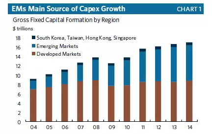 这条消息和经济学家戴维·列维一直以来对全球经济的看法不谋而合。列维指出,发现衰退迹象的关键在于观察全球投资情况。如果投资增多,利润就会增长,经济增速也会加快。如果投资下降,衰退就不会太远。在下图中可以看出,全球资本投资的增长动力一直来自新兴经济体,而非发达国家。