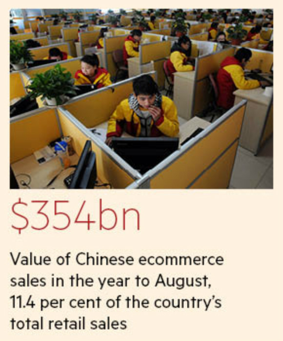 电商的出现推动了快递行业的增长。据国家邮政局的数据,2010年到2014年,这一行业每年增长速度超过50%。2003年,阿里巴巴推出了淘宝,这是一个eBay式虚拟跳蚤市场,供商家销售商品,也将客户流量带到他们的店铺。阿里巴巴后来又推出了天猫,一个专注于品牌大商家的类似网站。