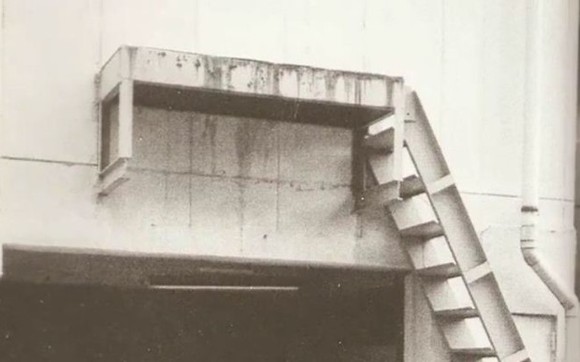 高楼的墙面上无故留下的金属踏板。相反的类型则是,没有楼梯连接却凭空出现在高楼墙面上的一扇门(不知怎么进入,一旦开门更会一脚踏空,危险至极)。