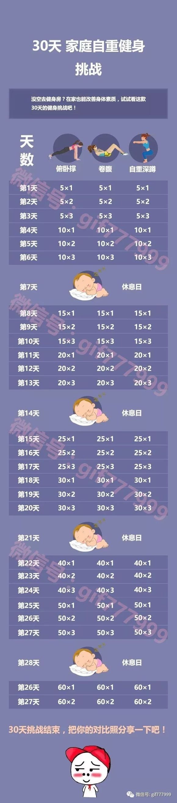 最近还有网友提出了一份「30天居家自重健身挑战计划」,仅仅利用最基础的三个训练动作——俯卧撑、卷腹和深蹲,通过长期训练以达到训练效果。