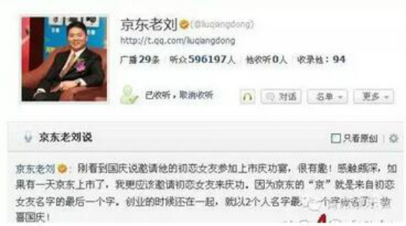 刘强东的初恋是龚小京,“京东”这一名字也起源于前女友。早在1998年,刘强东开始创业,龚小京是合伙人之一。他们的公司最初主要是在中关村卖软件和光盘。堂堂人民大学的高材生做卖光盘的,刘强东家人并不满意。龚小京家族三代从政,对于女儿经商更是不情愿。最终2003年,两个人分道扬镳。当当网上市的时候,刘强东发表了一番感慨:如果有一天京东上市了,我更应该邀请初恋女友来庆功。因为京东的“京”就是来自初恋女友名字的最后一个字。龚小京没有等来京东上市的这一天,但是重情义的老刘确实邀请了龚小京到美国见证了京东上市的激动时刻。