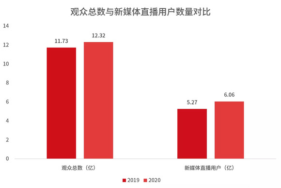 2020年春晚除传统的电视台直播外,还融合新媒体,进行多渠道直播。在12.32亿观众中,新媒体端直播用户规模为6.06亿人,相对去年增加了7900万人。此外,观众通过新媒体平台及快手、腾讯、爱奇艺、优酷、微博等第三方合作平台对春晚内容的点播总数达30.66亿次。