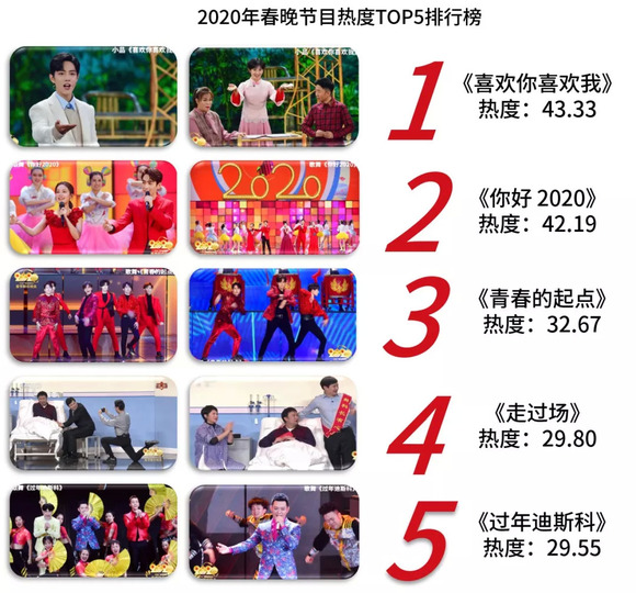 今天,华谊兄弟研究院(ID: HBresearch)将根据数据回顾2020年央视春晚概况,从节目热度、表演明星、直播技术与渠道等方面探讨今年的亮点,及与往昔春晚的区别。