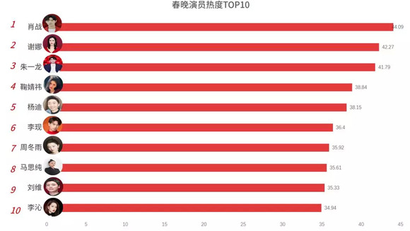 今年的春晚依旧是众星云集,星光璀璨。除张国立、宋丹丹、李谷一、刘欢等老牌明星的助力,还有朱一龙、陈伟霆、李现等流量小生集体加盟。经微热点统计,首次亮相央视春晚舞台的肖战凭借小品《喜欢你喜欢我》独揽春晚演员热度第一的位置,而一同出演该小品的谢娜、鞠婧祎、杨迪均位列前十。流量明星在春晚演员中的占比逐渐增大,2020年流量明星在节目数量和参与程度上更是全面“制霸”。据不完全统计,至少有四十位当年的话题明星出现在央视春晚的舞台上,相关节目约15个,占据全部节目数量的40%。由此可见,央视春晚倾向于依赖流量明星带来的话题度与年轻观众群体的关注。