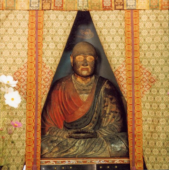 在日本,鉴真不但创立了律宗,成为一代宗师。而且,他还把中国的书法、语言、文学、医药和印刷技术等传入日本,影响巨大而深远。他晚年在奈良建造了一座唐式寺院——唐招提寺,寺院采用了唐朝宫殿的建筑样式,流传至今,成为绝响,为今日研究和复原唐式建筑,留下极其珍贵的实物证据。唐招提寺被日本列为国宝,其宏伟的金堂,以丰肥之柱,雄大之斗拱,承远大之出檐,是现存日本天平时代最大、最气派的建筑。而安放鉴真坐像的御影堂,乃唐招提寺灵魂所在,不对外开放。承唐招提寺美意,笔者得以进入御影堂,拉开内室狭窄的门扉,瞻仰鉴真慈祥的容颜,并在光线不足的情况下拍下这幅珍贵的鉴真坐像照片。