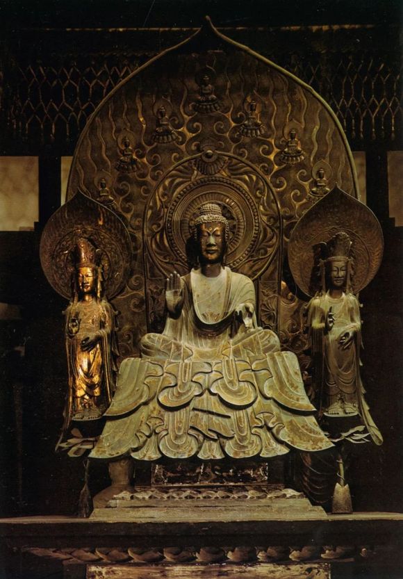 自从圣德太子将佛教立为国教后,日本佛教就一直在中国和朝鲜的佛教影响下迅速成长。奈良最古老的寺院飞鸟寺,也称作法兴寺,供养的飞鸟大佛,稍长而刚健的造像,明显带着中国北朝的风格。大佛的眼睛为杏仁形状,而法隆寺供养的圣德太子像,也是杏仁形眼,体现出飞鸟时代雕刻的特点。世界文化遗产法隆寺,于推古天皇十五年(607)由圣德太子建造,是世界上现存最古老的木构寺院,正殿安放的释迦三尊像,由来自中国的移民“鞍作部之首止利”负责铸造,同样具有中国北朝的佛像特点,作者巧妙地用佛陀轻薄的袈裟衣褶装饰基座,庄严优美、栩栩如生。法隆寺是古代佛教艺术的瑰宝。