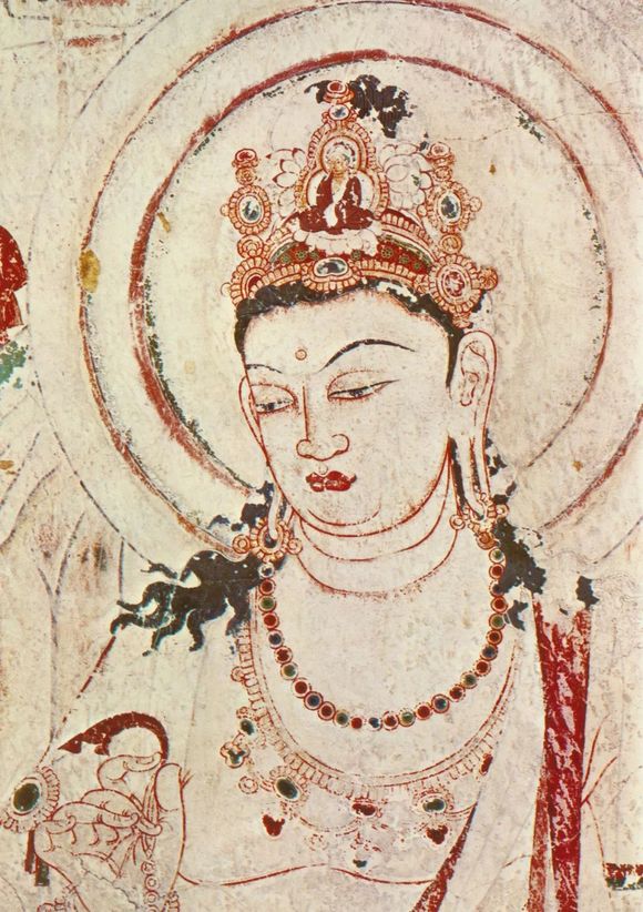 在正仓院的藏品中,有一件珍贵的墨画菩萨像,被称作“墨绘麻布菩萨”。画高138.5厘米,宽133厘米,由两块麻布缝接而成,描绘菩萨坐在云朵之上,自天而降。菩萨浓眉高颧,深目细长,下颌前曲,体态丰满,颇似西域胡人形象,可以看出波斯萨珊王朝的影响。菩萨衣带飘扬,线条奔放,颇有唐朝画圣吴道子“吴带当风”的风格。而且,菩萨高髻戴冠,这在唐代十分常见,在日本也可以找到相似的绘画。法隆寺壁画中的菩萨像,同样是高髻着冠;而敦煌壁画中的供养菩萨像,也是相同装束。墨画发达于唐朝,传播于东亚各国,正仓院这幅墨画菩萨像堪称日本天平时代的墨画杰作,是日本仅存的水墨白描画,弥足珍贵。