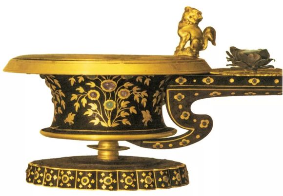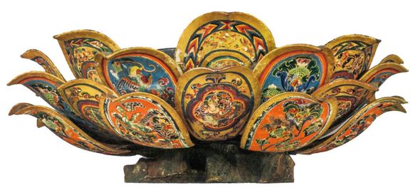 漆金薄绘盘是正仓院收藏的另一件艺术珍品。它是一件木质漆器,宛如一朵盛开的莲花,底座上有四层花瓣,每层八片,中心是半球形的莲心。木雕的莲瓣,轻盈委婉,向外款款绽放,造型极为优美。每片花瓣均鎏金施彩,绘有鸳鸯、衔花鸟、迦陵频伽和狮子等精美图案,铅丹、朱、群青、胭脂、靛蓝等各种颜色交织在一起,显得无比华贵。乍看仿佛佛陀的莲花座,但在底座上有墨书“香印坐”,据此可知乃香炉的台座,供于佛陀案前,它在香烟缭绕中金光闪闪,熠熠生辉。