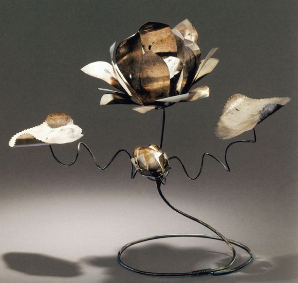 清池生莲花,优雅芬芳,象征着圣洁,令人神往。佛教以莲花作为往生的寄托、报身净土,平常供奉于佛像之前。正仓院南仓收藏着一件用日本厚朴材木雕成的莲池,底座雕成蜿蜒起伏的池堤,池底用白色描绘白沙,放置贝壳,一株莲花出水,主茎绽放三朵莲花,有莲蓬为芯,左右两茎托起两片荷叶,还有两株莲蕾含苞待放。莲茎用金铜制成,莲蓬、花瓣、翻叶都是木雕贴金箔,极其精巧。如此优美的造型,也出现在法门寺地宫出土的文物中,令人惊喜。这件文物被称作“银芙蕖”,芙蕖就是莲花。法门寺的这枝芙蕖以银箸做莲茎和底座,用银箔做成花叶,主茎顶端有莲蓬为芯的莲花一朵,内外三层,共十六瓣。主茎中部有莲蕾一朵,由此分出两枝莲茎,左右伸展,荷叶翻卷,舒展飘逸。