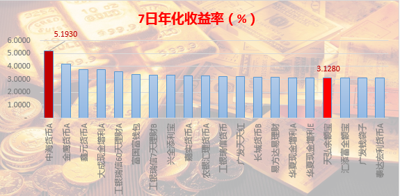 宝宝类基金主要特点,都具备互联网基因,同时可以实现T+0交易,并且具备较低的认购起点。界面新闻整理了截至10月9日,全部宝宝类货币型基金(T+0)的7天年化收益率信息(均不考虑申购金额大于1万元的各种基金)。在全部的78款宝宝类基金中,收益率最高的是中海货币A,最新的7天年化收益率高达5.193%。天弘余额宝以3.128%的年化收益排在第17位。7天年化收益率排名前20的宝宝类基金如下表: