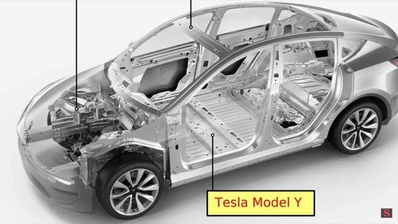 Model Y的白车身不是典型承载式车型结构,有较为明显的车架来强化承载及受碰撞能力。