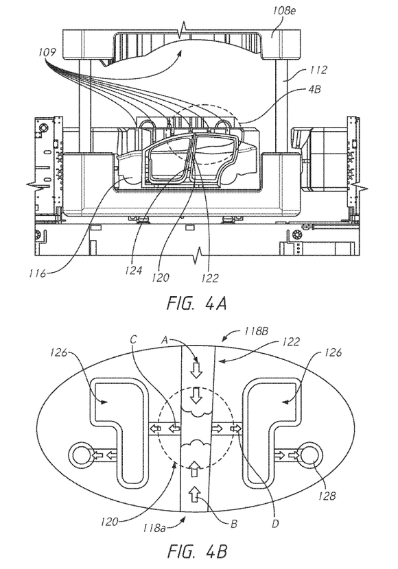 根据特斯拉专利资料,我们看到了如下图所示的车架多向铸造机示意图。它的左右是对称的,也就是完成左右侧围的铸造;前后铸造机则是负责前、后舱体的铸造。