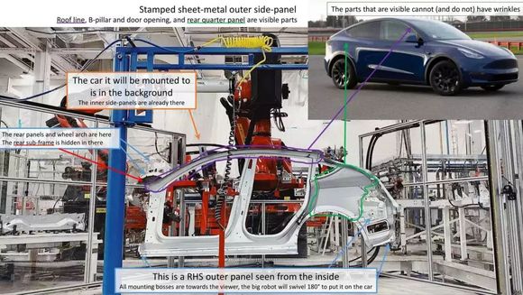 我们知道Model Y是基于Model 3开发而来,要说短时间内有突破性制造技术不太可能。我们从特斯拉弗里蒙特工厂的生产图看,Model Y并没有采用专利中所述的一体成型工艺。比如外侧围这部分,下图明显是传统的侧围外板,并不是多层钣金一次成型。