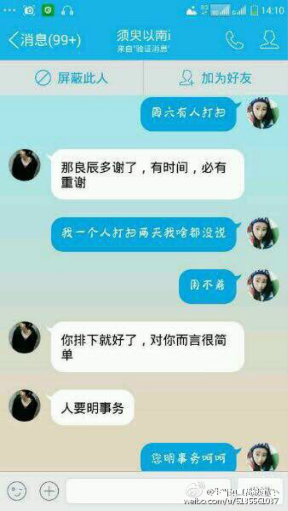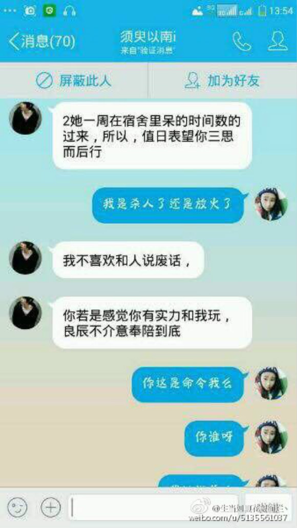 9月25日,一个自称叶良辰的名字冲进了微博热搜榜,原因来自一段气侧漏的QQ对话截图。从对话来看,叶良辰是在跟一名叫静静的女宿舍长叫板,威逼对方帮一位叫李汶济的女生调换值日。