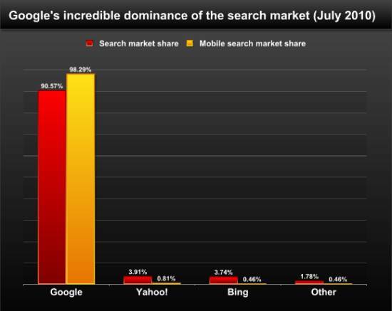 2010年7月谷歌全球移动搜索市场份额高达98.29%