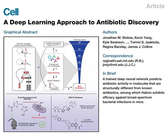 MIT 科学家用深度学习模型发现的「halicin」抗生素分子展示了前所未有的广谱抗菌能力,这是人类首次完全使用人工智能的方法发现新抗生素。研究人员表示,halicin 可以消灭一些世界上最危险的细菌。他们的这一研究登上了生命科学顶级期刊《Cell》。