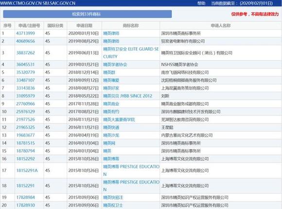 针对截图(三)中所列的10枚"精英律师"商标,经查询,目前都在审查中,其结果如何?我们静待国家知识产权局的审查结果。