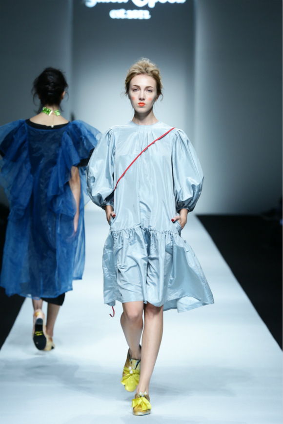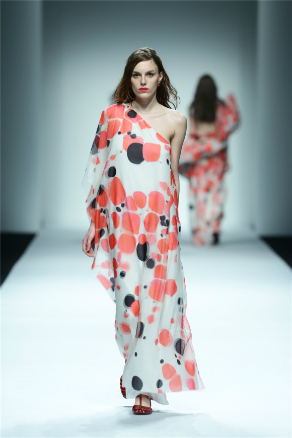 “我觉得穿这些衣服的应该是独立、坚强,热爱自由的女性。”张娜在接受界面专访时说道。与“微观世界”主题相呼应,象征着细胞与血液的圆点与条纹反复出现,与Grand Studio平面设计师张软人合作设计的女性人形图案多次用于肩带、胸襟或裙摆处。