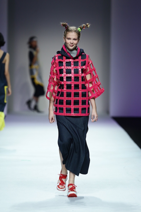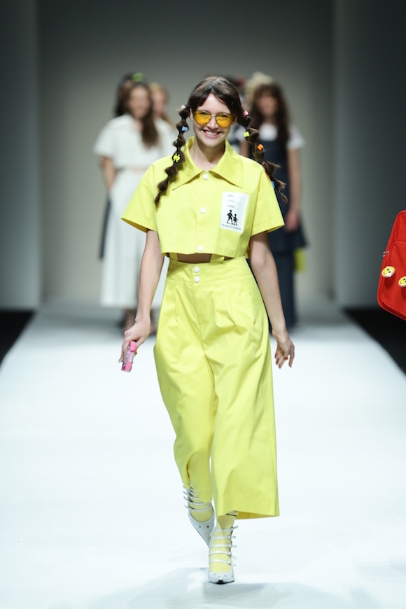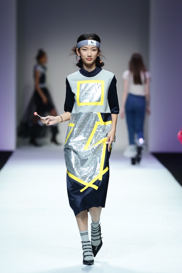 一个个“初高中生”,穿着过长、过大的尖头皮鞋,顶着王菲和郑秀文90年代末爱画的挑眉、唇线妆,或吃着棒棒糖,或玩着游戏机,“淘气”地蹦跶在T台上。