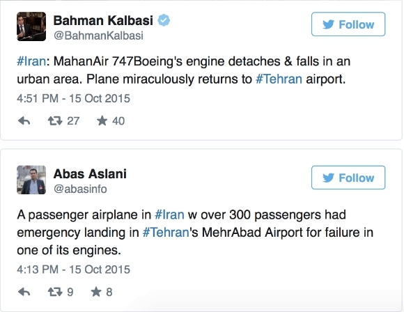 据《国际财经时报》报道,当地时间15日清晨,伊朗私人航空公司马汉航空(Mahan Air)的一架客机在由德黑兰起飞后突遇引擎故障,导致飞机不得不寻求紧急迫降。当地媒体的记者在第一时间发Twitter证实,事发时载有300名乘客的客机最终奇迹般地安全迫降于德黑兰的伊玛目·霍梅尼国际机场,所幸并未造成人员伤亡。