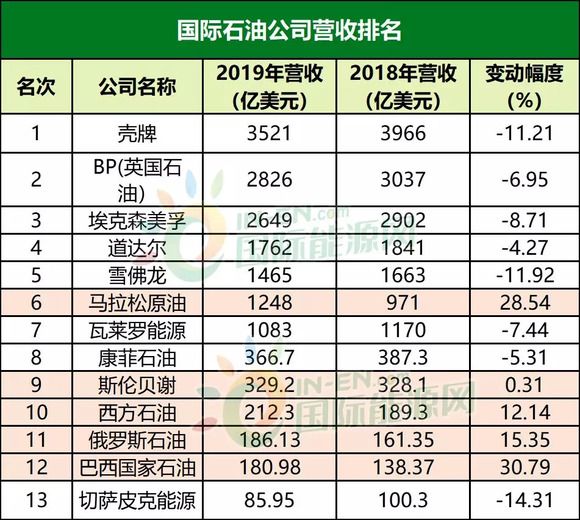 国际石油市场近年来一直处于不太景气的态势,2019年犹为严重。勘探成本上涨、天然气价格下跌等原因让诸多石油公司在2019年的经营业绩出现了下滑,据国际能源网记者不完全统计,13家世界石油公司中营收下滑的有8家,占比61.54%,其中有三家公司营收下滑幅度超过10%。