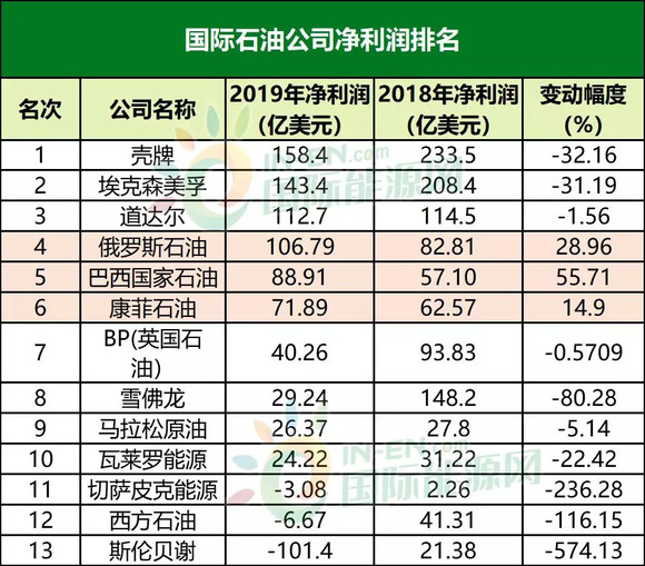 如果说从世界知名石油公司的营收情况还看不清行业发展趋势,净利润的普遍下滑则揭示了2019年石油整个行业发展的低迷态势。国际能源网记者发现,13家国际知名石油公司中,仅有俄罗斯石油、巴西国家石油和康菲石油3家公司实现增长,其余10家公司净利润均出现下滑,其中斯伦贝谢的下滑幅度最狠,同比下降574.13%。