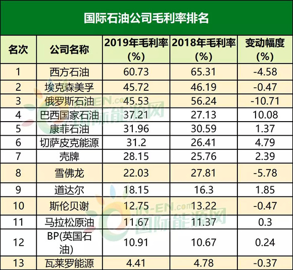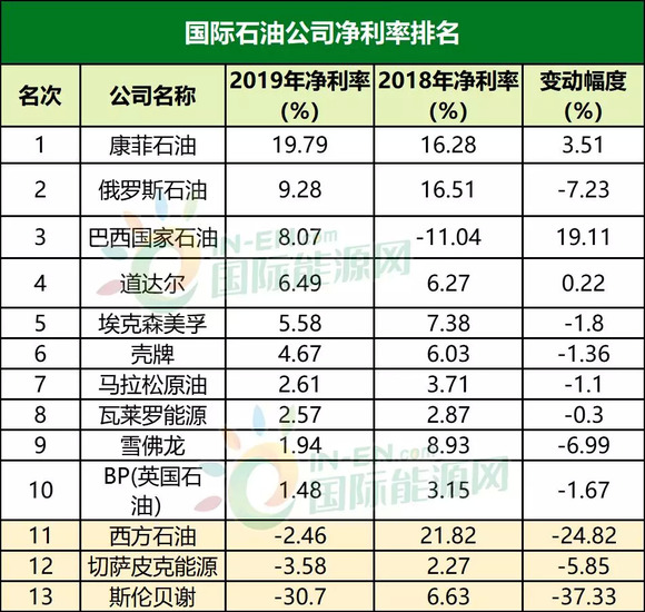 这些国际知名石油公司2019年的盈利几乎都出现下滑,很重要的原因是净利率水平较低。13家公司中,净利率最高的康菲石油的净利率只有19.79%,大部分公司的净利率是单位数甚至有西方石油、切萨皮克能源和斯伦贝谢三家公司的净利率是负数。