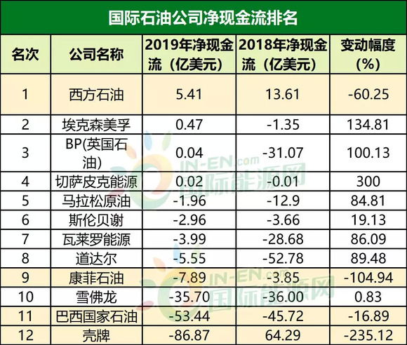 如果说净利润下滑只是国际石油公司发展状态不佳的表象之一,那么净现金流不足就是让其后续发展乏力的重要原因。从整体看,13家榜单企业中只有西方石油公司的净现金流维持在个位数,埃克森美孚、BP这样的世界500强企业的净现金流居然只有几百万美金,9家公司净现金流告负,俄罗斯石油的净现金流竟然为-91.05亿美元,同比下滑-218.43,壳牌也如同难兄难弟一样,净现金流为-86.87亿美元,同比下滑235.12%。
