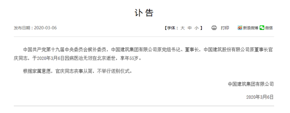 3月6日午间,中国建筑(601668.SH)在官网发布讣告,中国建筑集团有限公司原党组书记、董事长,中国建筑股份有限公司原董事长官庆同志,于2020年3月6日因病医治无效在北京逝世,享年55岁。