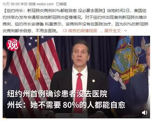 前两天,美国纽约州举办发布会通报当地新冠肺炎疫情情况,该州州长安德鲁·科莫表示,80%的新冠肺炎病例都会自愈,不用去医院。
