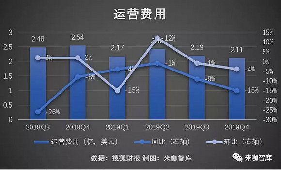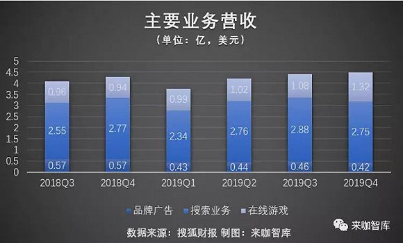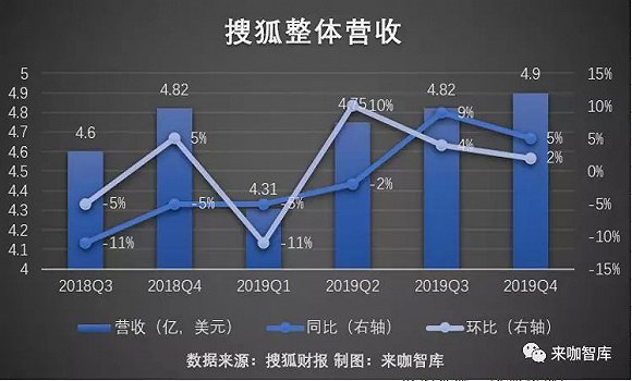 而从此次财报中营收结构的变化来看,搜索及在线游戏两块业务的营收,整体呈上升趋势,但品牌广告则呈连续下降趋势。来咖智库还发现,品牌广告、搜索以及在线业务三块业务,在2019年总营收的占比分别为9.5%、57.8%、23.8%,而2018年此三项分别为12.3%、54.2%、20.7%。这意味着,与搜狐媒体属性关系最为密切的品牌广告业务,已经下降到个位数,规模和比重下滑严重。