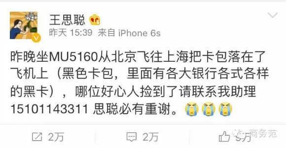 昨天思聪老爹王健林刚坐会首富宝座,思聪就在坐飞机的时候把卡包丢了。十万火急的思聪跑到微博上发了寻物启事求助(颇有些病急乱投医的意味,连助理电话都暴露了)。٩(ŏ﹏ŏ、)۶