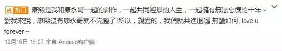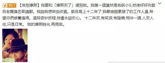 言谈之间,预示着他即将离开《康熙来了》的事实。随后,小S当即在微博回应:“《康熙》是我和康永哥一起创作,一起共同经历的……康熙没有康永哥就不完整了。所以,亲爱的,我们就共同进退了……”