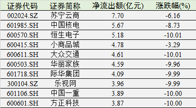 在净流出个股中,苏宁云商(002024.SZ)、中国核电(601985.SH)、恒生电子(600570.SH)三只个股净流出额居前,分别为7.70亿元、5.67亿元、5.18亿元。其中,苏宁云商今日大单流出达26.40亿元,而中国核电也遭遇8.48亿元的主力资金离场。