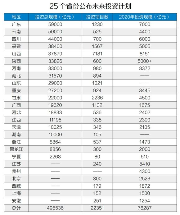 在已经公布的25个省市中,云南5万亿的投资规模,仅低于广东,在西部排第一;其中2020年要完成4400亿元,规模同样超过多数省市。
