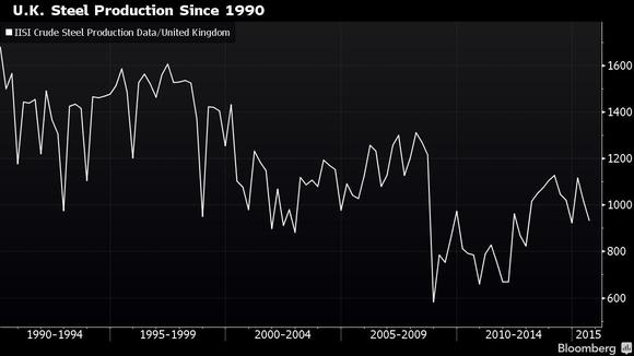 从1990年代至今,英国钢铁产量几乎减半。2013年,英国钢铁产量还不到1200万吨。