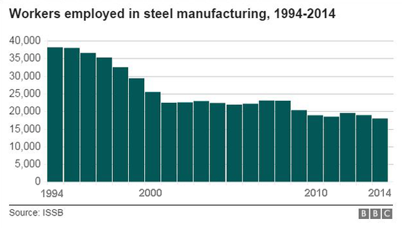 英国钢铁业的从业人数从1970年代20多万人锐减至不到2万人,英国钢铁业艰难度日,部分英国钢铁厂商和工会认为是中国出口廉价钢铁造成的。