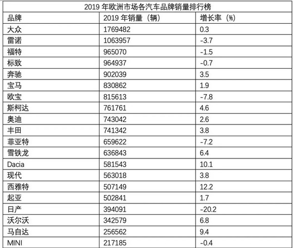 区别于世界“大盘”的下滑,2019年的欧洲市场绝对称得上“稳中有进”!根据ACEA公布的数据显示,2019年欧盟和欧洲自由贸易联盟的乘用车销量为1580.58万辆,同比增长1.2%。其中在12月份的涨幅高达21.4%,进而保证了全年增长。从车型销量上来看,大众集团、PSA集团以及雷诺集团位列前三,那么对于其他品牌而言,表现又如何呢?