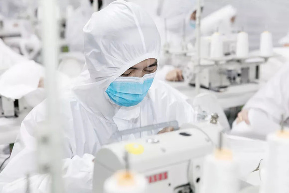 上图:利郎工人在无菌洁净车间赶制医用防护服