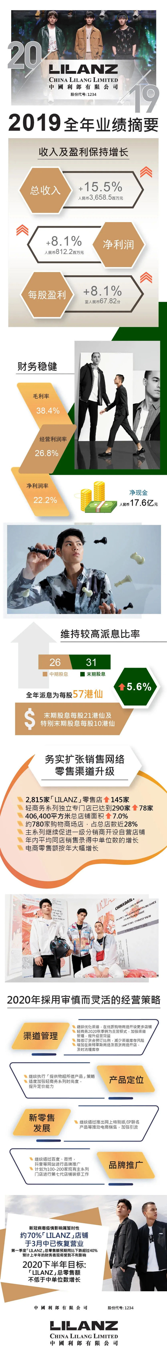 同时,利郎(LILANZ)公布了新冠疫情对企业带来的影响,介绍企业所采取的积极务实的应对举措——2020年第一季度「LILANZ」总零售额预期同比下跌逾40%,将影响上半年财务表现;集团已全面有序复产,三月中,70%的 LILANZ 品牌店铺已恢复营业,下半年总零售额目标不低于中单位数增长。