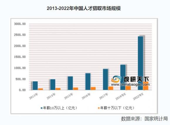 据观研天下发布《2019年中国人力资源服务市场分析报告-产业竞争现状与投资前景研究》显示,2017年,中国中高端人才市场规模达到969亿元,2022年预计达约2437亿元,明显高于同期平均年薪10万元以下的人才市场的复合年增长率。中高端人才获取服务所得收入占整个人才获取服务市场总收入的80%。